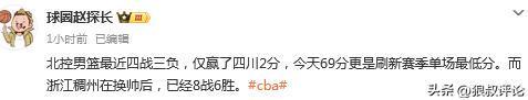 媒体人球圈赵探长发文点评:北控男篮最近四战三负,仅赢了四川2分,今天69分更是刷新赛季单场最低分。而浙江稠州在换帅后,已经8战6胜。