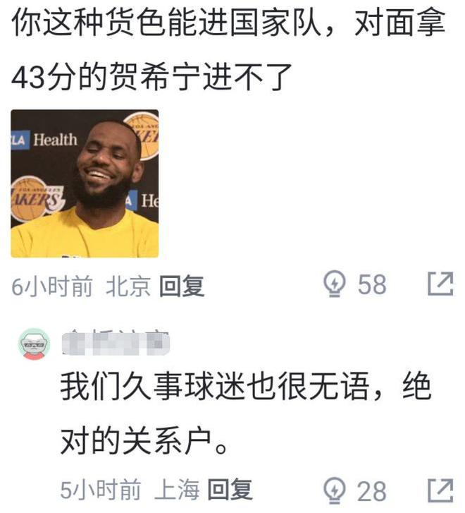 相反,刘礼嘉数据的水分很大,赛后有不少球迷在评论区对他表达了不满:你这种货色都能进国家队,对面拿43分的贺希宁却进不了;上海球迷也表示认可:我们久事球迷也很无语,绝对的关系户。