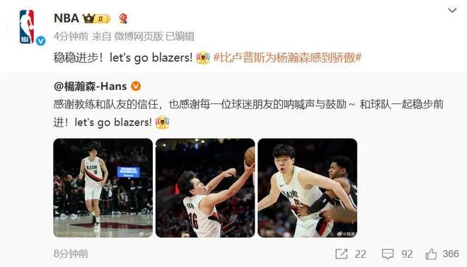 NBA官方随后转发杨瀚森博文:稳稳进步!let's go blazers!