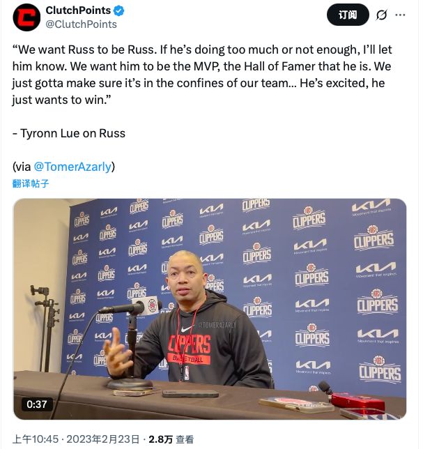- 雷速体育10月20日讯 美媒NBA Memes今日更新社交媒体,发文调侃了威少:“快船主教练泰伦·卢在2023年说:我们希...发表于: 10-20 19:42