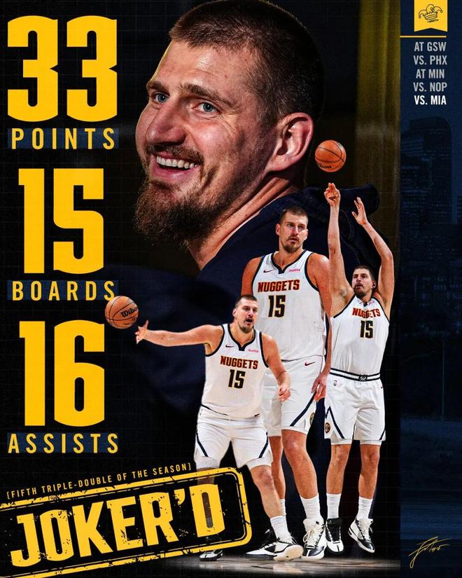 上一场比赛,掘金主场122-112力克热火,约基奇交出了赛季至今个人最好的表现:全场出战36分钟,投篮18中12,三分5中2,罚球8中7,得到33分15篮板16助攻3抢断。