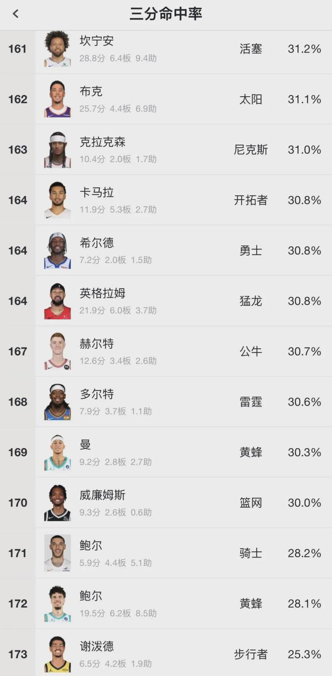 他场均三分出手数高居联盟第7,仅次于库里(12)、东契奇(10.9)、米切尔(10.6)、马克西(9.6)、马尔卡宁(9.1)。但是三球的三分命中率只排联盟第172位!大家猜猜三分命中率第171位是谁?正是他的亲大哥:球哥!