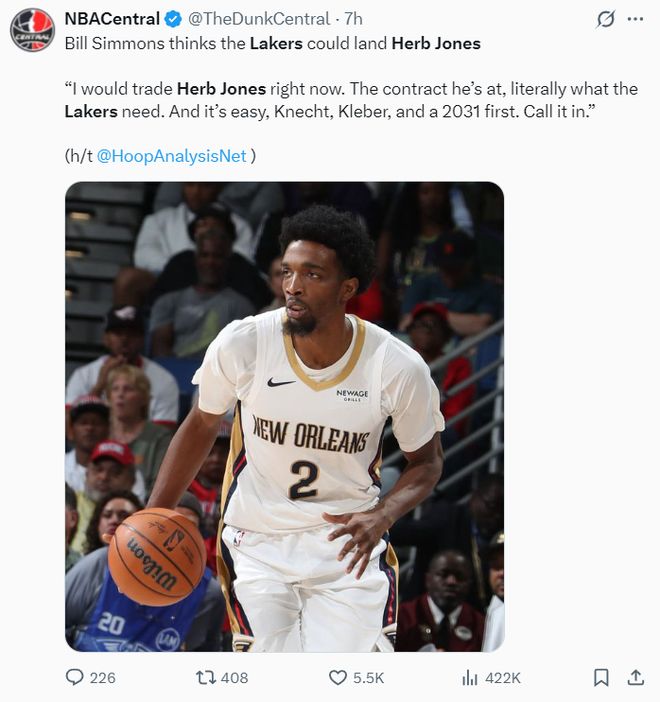 北京时间12月11日,NBA名嘴比尔-西蒙斯在节目中透露:洛杉矶湖人队有希望交易得到赫伯特-琼斯,他们现在只需要一个电话,愿意送出克勒贝尔、克内克特、1个首轮签都可以得到赫伯特-