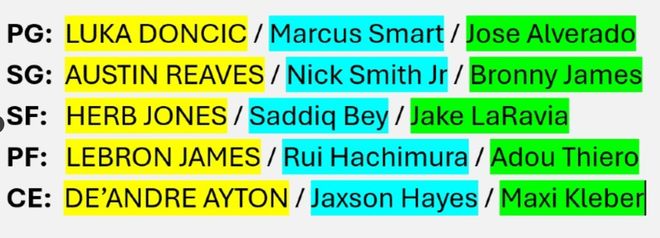 他还列出了湖人全新的15人名单,前提是将尼克-史密斯的双向合同转正: