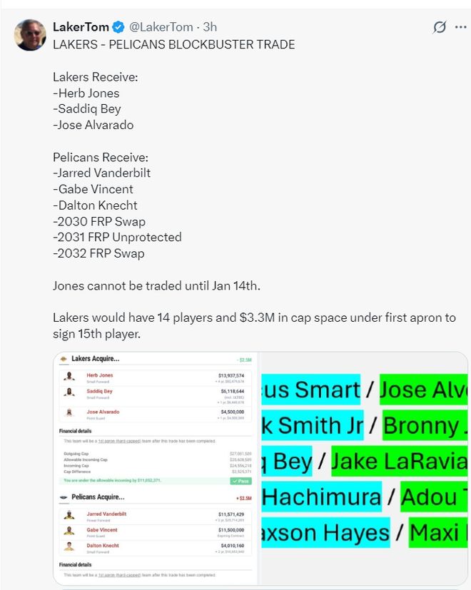 湖人媒体laker Tom为湖人模拟了一套大交易方案,他认为湖人不该只交易赫伯特-琼斯一人,湖人应该借此机会扩大交易进行超级补强。