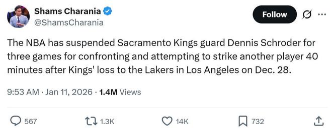 11日早ESPN名记Shams突然在社媒放出重磅消息,曝出国王后卫施罗德被禁赛3场,原因是在12月29日湖人对阵国王赛后40分钟,施罗德与湖人一名球员发生冲突,并试图殴打对方。