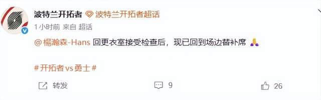 1月14日开拓者对阵勇士的比赛中,中国球员杨瀚森因拼抢地板球时后脑勺猛烈撞击勇士球员理查德的膝盖,导致受伤离场,随后经检查确认无大碍并返回替补席。刚刚,杨瀚森本人发文回应: