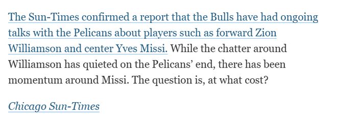 公牛鹈鹕谈判交易锡安!中锋米西也在讨论范围内武切怀特成筹码