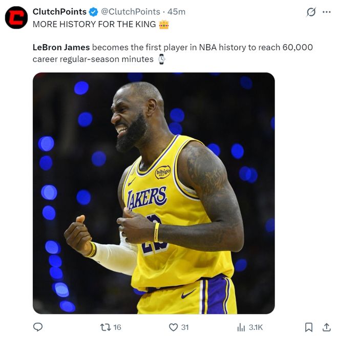这场比赛勒布朗-詹姆斯还完成了常规赛6万分钟的里程碑,他再度刷新了一项历史首人纪录。不过,此役勒布朗的发挥很差,27分钟,10中3,三分3中0,罚球6中5,拿到11分5助攻3篮板1抢断6失误,命中率30%,正负值-23。(勒布朗的二重扎心)
