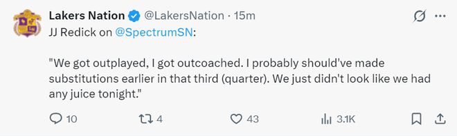 北京时间1月29日,湖人99-129惨败骑士。湖三崩虽迟但到,原本湖人在第三节开局只落后2分,短短2分钟被打了一波9-0落后到11分,之后湖人就是三军溃散、丢盔弃甲,第三节单节净负20分,末节还剩8分钟雷迪克提前投子认负吞下一场惨烈的失利。