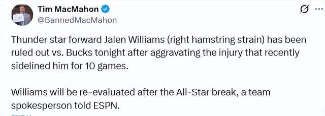 北京时间2月13日,据雷霆队发言人向ESPN透露,球队明星前锋杰伦-威廉姆斯不到四周内第二次右腿筋拉伤,将在全明星赛后接受复查。威廉姆斯将缺席今日对阵密尔沃基雄鹿的比赛。他此