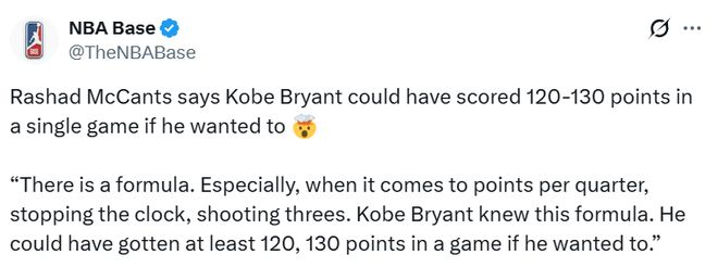 在接受《TheSportsRush》记者尼克姆-汗的独家采访时,麦坎茨坚持自己的得分理论。“这是有公式的。”麦坎茨断言,“尤其是按节得分、停表、投三分这些。科比也懂这个公式。如果他想,单场完全可以拿至少120、130分。”