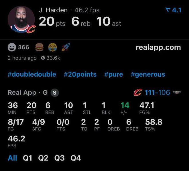 对了,哈登在带领骑士客场111-106战胜鹈鹕比赛中,可是以0罚球得到的20分外加10助,正负值+14冠绝全场,人家再次证明了只靠运动战得分照样能够收割比赛。