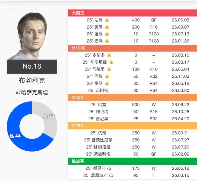 从成绩来看,布勃利克责任最大,他今年拿了1站500赛、3站250赛和1站175赛冠军,并且场地覆盖了硬地、草地和红土