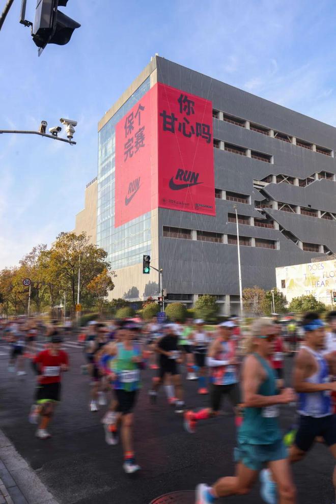 仅在上马赛道沿途,NIKE上天入地的大字报就多达十几幅,不得不承认,在平时看和在肌肉酸疼、意志力处于崩溃边缘时看,完全是两种感受。而且那么多句赛道文案,似乎总有那么一两句可以精准击中当时赛道上的你我。