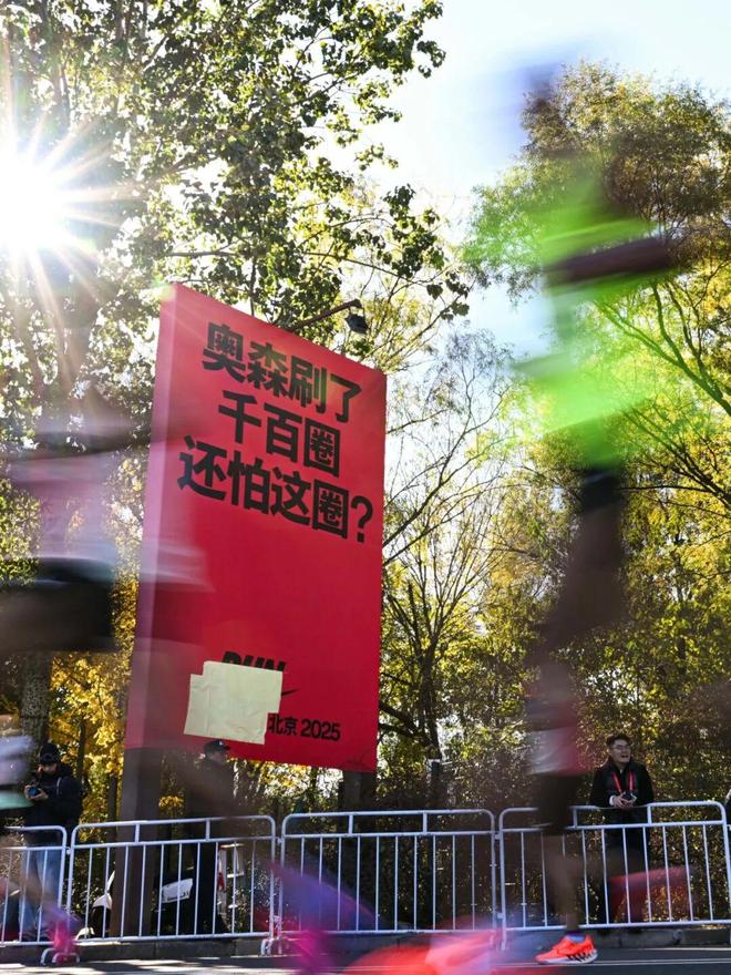 在媒体和跑者都在讨论这次上马NIKE的赛道“PUA文案”时,不知道还有没有人记得两周前北马赛道旁那块被胶布贴住LOGO的广告牌。