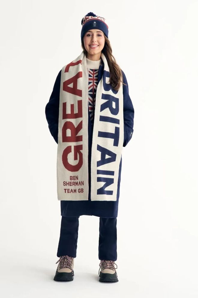 开幕式造型是一件羊毛犬牙纹大衣,内搭一件羊毛混纺高领毛衣,毛衣上饰有凸起的条纹和英国国旗图案,下身是饰有同色系英国国旗织带的运动裤,整体搭配着超大围巾和红白蓝三色鞋带的冬靴。闭幕式上,造型转变为宽松版型,运动员将身穿厚实的羊毛混纺针织运动外套,内搭一件海军蓝和米白色高领打底衫。
