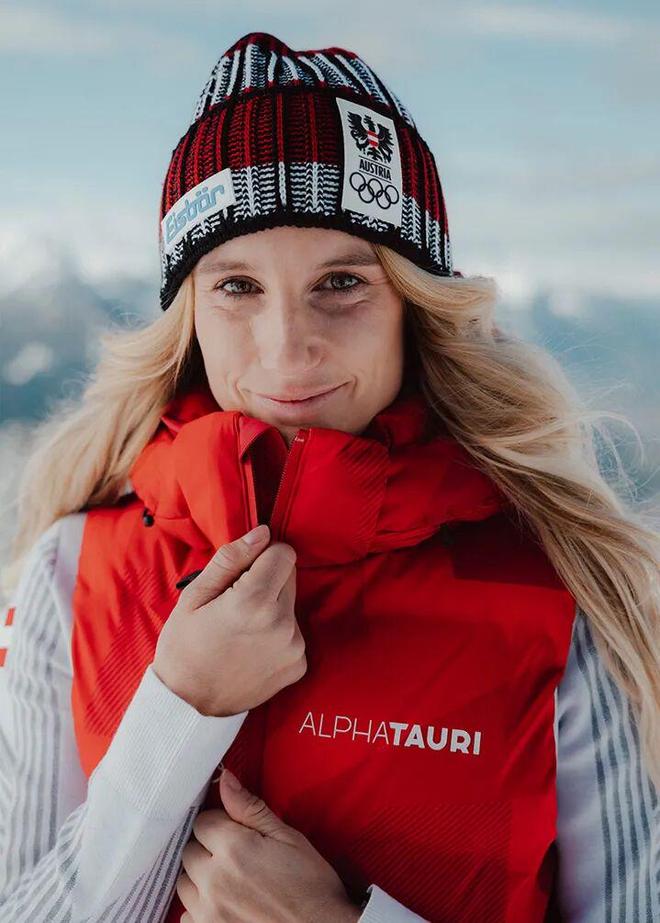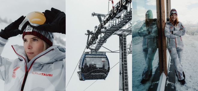 奥地利队本届的冬奥服装,由奥地利红牛集团在2016年创立的时尚品牌AlphaTauri提供,设计灵感源自阿尔卑斯山脉的壮丽景色,采用流畅的廓形和醒目的图案印花来展现白雪皑皑的山峰上光影交错的风景。