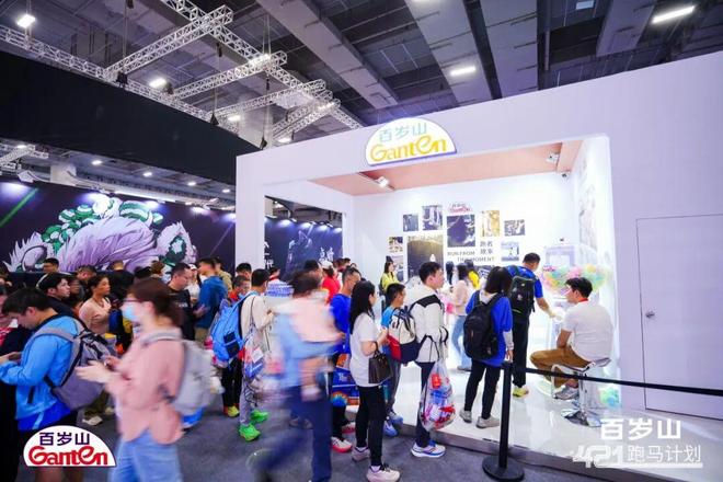马拉松博览会现场,百岁山特设品牌互动体验区。赛前跑者可在展位“故事墙”分享自己的奔跑心声,发布 话题内容,即可参与扭蛋互动,领取百岁山专属跑马周边。