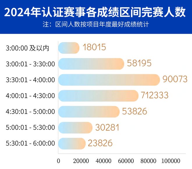 随着后续路跑赛事的极速发展,比赛场次、比赛规模、大众成绩都大幅上涨。据中国路跑蓝皮书显示,2024年马拉松赛事共有254场(认证赛事为180场),总规模为116.64万人次(认证赛事规模为100.3万人次),最终认证赛事中完赛人数为34.54万人,其中破三人数为18015人(其中男子17275,女子740)人,相较2023年破三的11897人,增加了6118人。据不完全统计,2025年中国马拉松全马破三总人数约为2.5万-2.8万人。