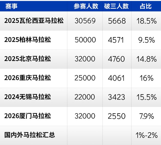 即便参赛人数增长,但在全年近百万马拉松完赛人次中,破三者仍在少数。