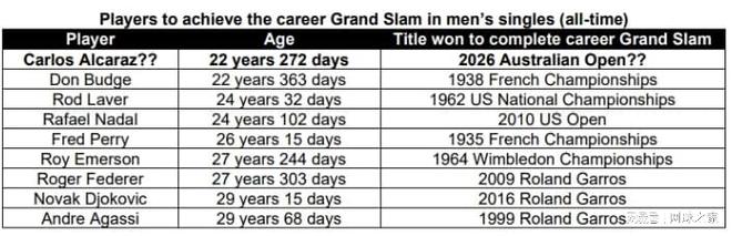 换句话说,阿尔卡拉斯只要再拿下澳网冠军,就能完成 “职业生涯全满贯”,就算放眼整个公开年代,这项成就也仅为极少数顶尖选手所专属。数据足以说明一切:公开赛时代仅有 5 位球员达成这一成就,分别是罗德・拉沃尔、阿加西、费德勒、纳达尔和德约科维奇。