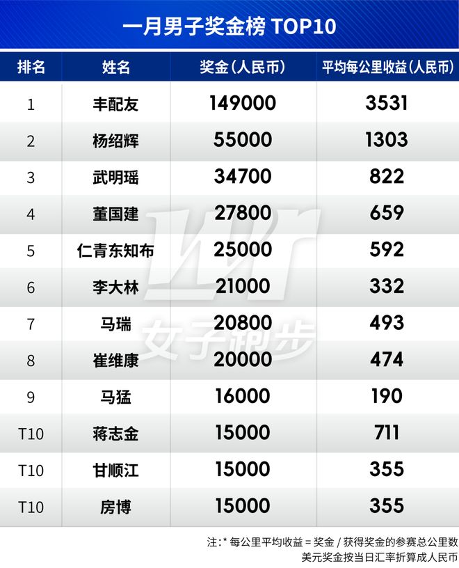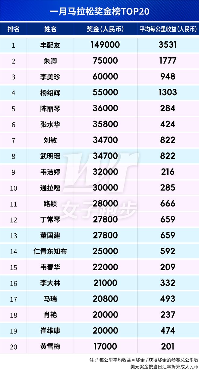 今年一月马拉松国内总奖金超190W,朱卿丰配友领衔月度奖金榜