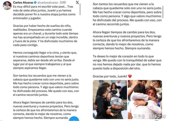 在他的分手信中,阿尔卡拉斯写道:“我们从我还是个孩子时就开始了这段旅程,在这段时间里,你陪伴我走过了一段不可思议的旅程,无论是在场上还是场下,我非常享受与你共度的每一步。”