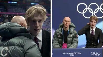 其中,最动人的一幕发生在花样滑冰赛场的“kiss and cry”区域。这一区域是运动员完成比赛后,和教练一起等待出分的地方。当时,24岁的美国选手马克西姆·瑙莫夫(Maxim Naumov)刚刚完成自己的比赛,他攥着张泛黄照片,那是父母牵着3岁的他初次滑冰的合影。