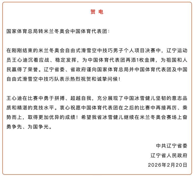 2月20日,辽宁省委省政府发贺电:在刚刚结束的米兰冬奥会自由式滑雪空中技巧男子个人项目决赛中,辽宁运动员王心迪沉着应战、稳定发挥,为中国体育代表团再添1枚金牌,为祖国和人民赢得了荣誉。辽宁省委、省政府谨向国家体育总局并中国体育代表团及中国自由式滑雪空中技巧队表示热烈祝贺和诚挚问候!