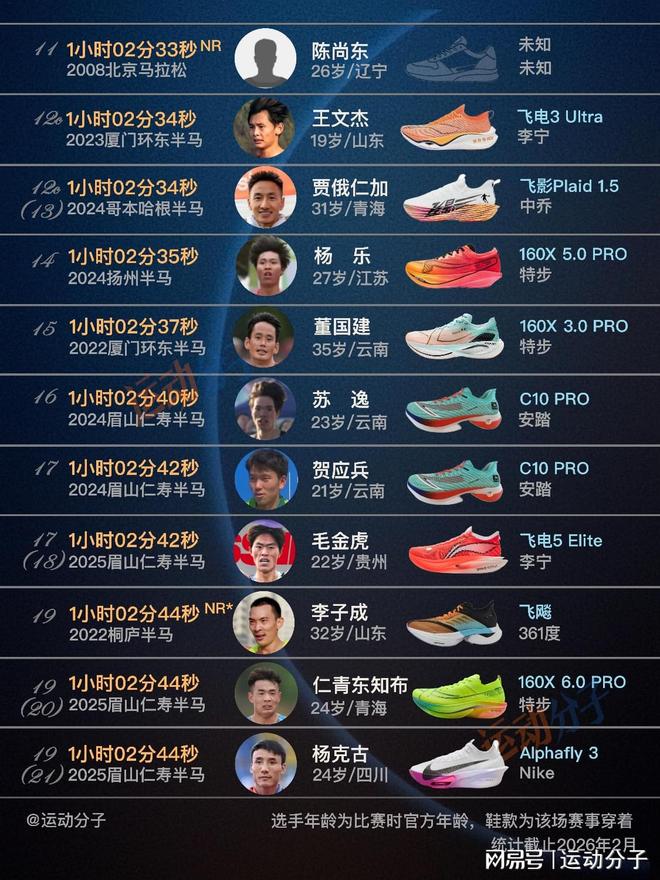 榜单里并没有何杰和杨绍辉——杨绍辉半马pb 1小时02分48秒(2024眉山仁寿);何杰很少跑半马,24年无锡2小时06分57秒破国家纪录时,前半程用了1小时03分26秒——相比全马,两人在半马并无优势,半马也不是他们会全力去追求成绩的距离。