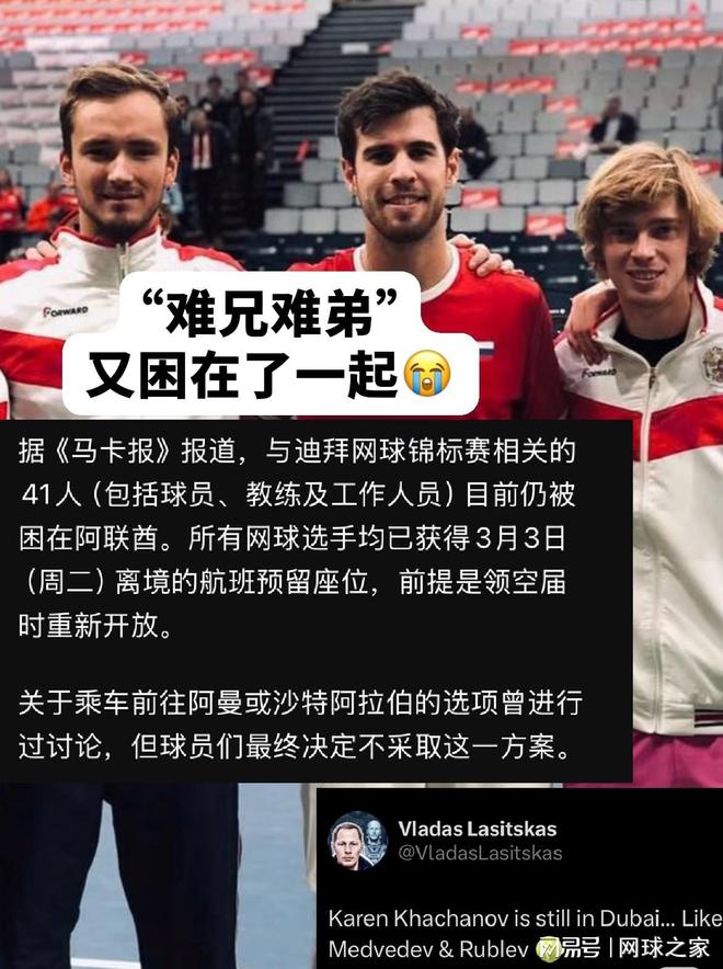 随着外媒的消息更新,当前ATP被困于迪拜的人员一夜之间又暴增了许多。据《马卡报》报道,目前ATP被困于迪拜的人员多达41人,包括球员、教练、赛事工作人员等等。此前大家还以为受