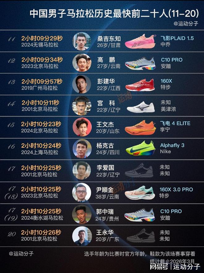 中国男子马拉松历史前20快成绩,来自9位运动员。现役7人,合计贡献14个:刚刚刷新国家纪录的最强00后丰配友,和杨绍辉都是4次上榜,杨绍辉也是当下中国跑进210大关次数最多的人(6次);中