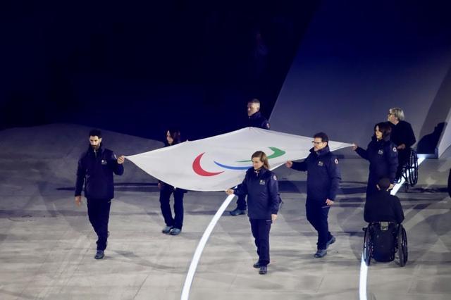 意大利残奥会运动员将残奥会旗帜抬上舞台,并将旗帜交给意大利国民保护部门,在残奥会会歌的演奏下,升起旗帜。