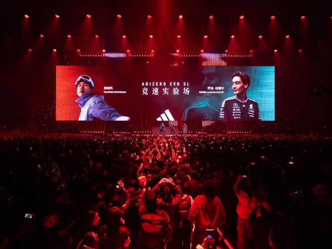 乔治·拉塞尔与苏翊鸣破圈联动,联袂登场。拉塞尔驾驶AMG跑车以标志性“甜甜圈”漂移震撼开场,用引擎转速与轰鸣点燃全场脉搏;随后二人于舞台上围绕“速度”主题展开互动,以趣味横生的问答加深彼此交流,跨界演绎“只有adidas才能拉起的速度”,宣告竞速实验正式开启。