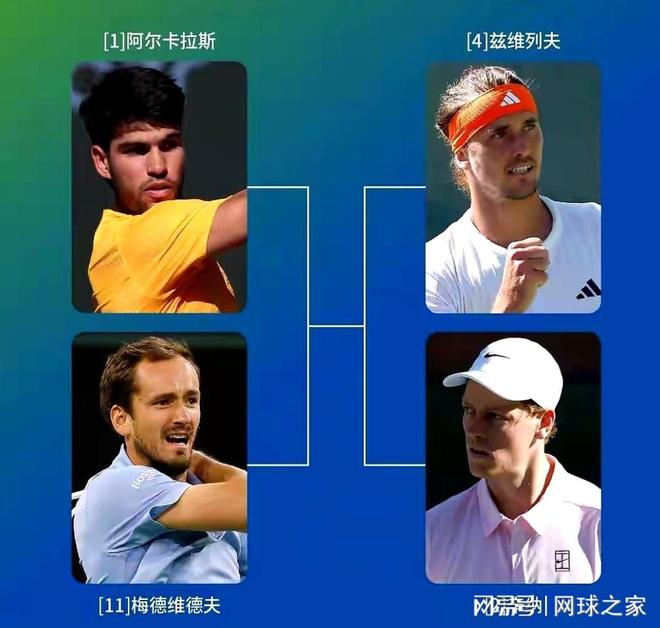 由辛纳、小兹维列夫、阿尔卡拉斯和梅德韦杰夫组成的印第安维尔斯大师赛四强阵容确定后,彻底让这站大师赛的话题热度飙升了起来。阿尔卡拉斯迎战梅德韦杰夫,以及小兹维列夫同辛