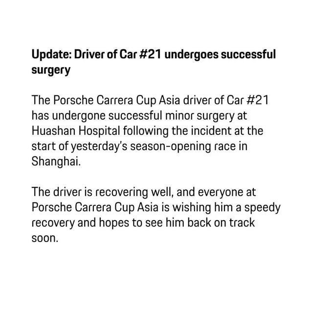 3月15日,亚洲保时捷卡雷拉杯房车赛组委会发布 “报平安” 信息:在14日上海揭幕战发车阶段遭遇事故后,保时捷卡雷拉杯亚洲组21号车手已在华山医院接受小型手术,目前车手恢复情况良好。