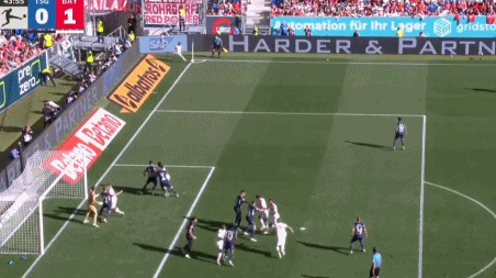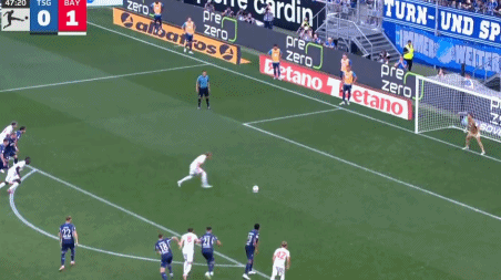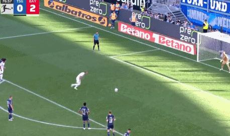 第81分钟,曹法尔主罚前场左侧任意球,基米希解围失误,球飞入球门,3比1!