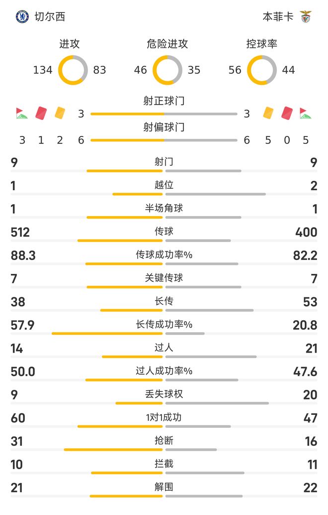 在过人方面,则反倒是本菲卡以21-14领先;过人成功率方面,则是切尔西以50%-47.6%稍稍领先。