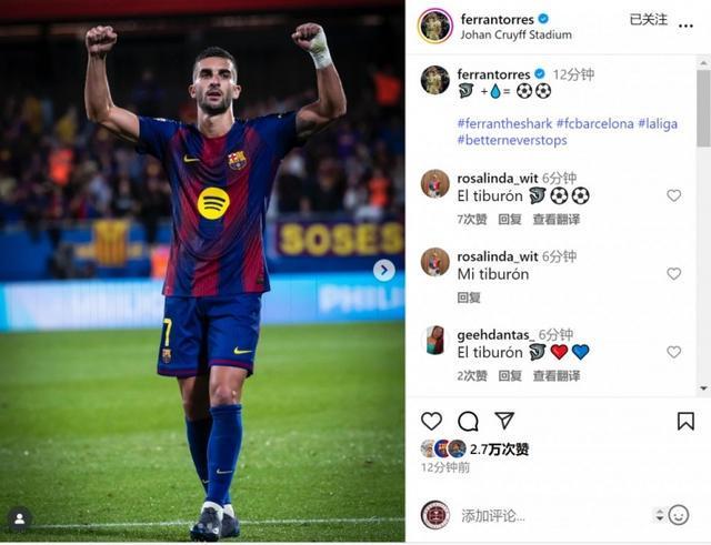 费兰-托雷斯赛后在社交媒体上晒出照片,庆祝取胜+打进2球,配文:“+=⚽️⚽️”