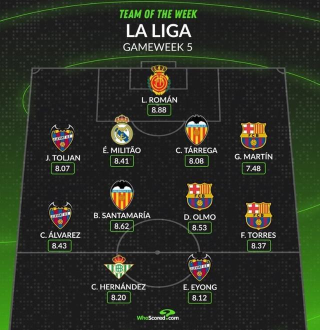 直播吧9月22日宣 西甲第五轮战罢,数据网站Whoscored也评选出本轮西甲最佳阵,费兰等巴萨3人在列,米利唐如选。以下为具体阵容:罗曼(马洛卡)托利安(莱万特)、米利唐(皇马)、塔雷加(瓦伦西