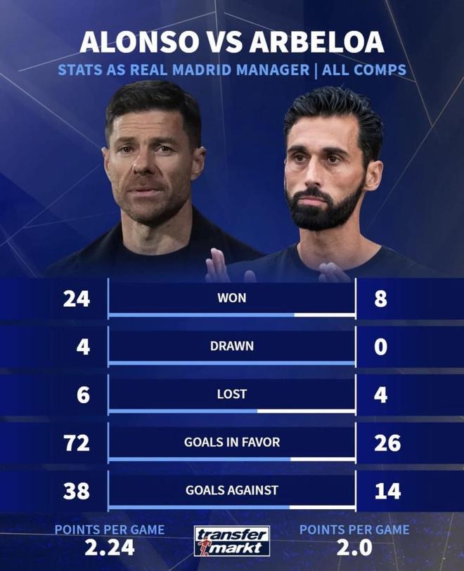 最近德国转会市场把阿隆索和阿韦洛亚执教皇马的一线队数据放到了一起:阿隆索带队34场,24胜4平6负,场均2.24分;阿韦洛亚带队12场,8胜4负,场均2.0分。只看这组账面数字,阿隆索并没有