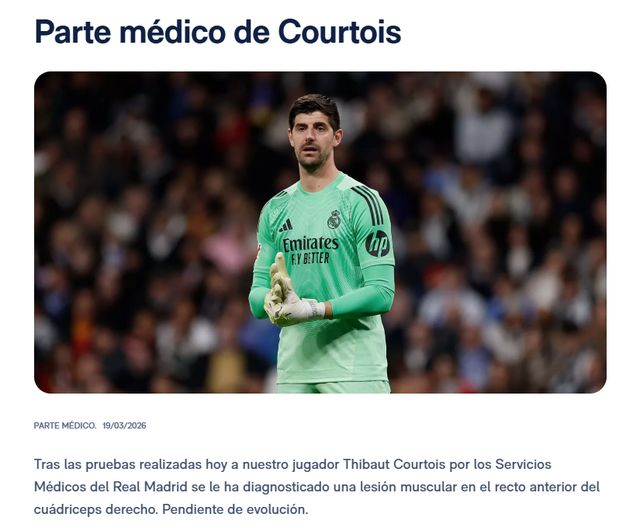 北京时间3月19日,皇马官方宣布,33岁的主力门将库尔图瓦右腿肌肉受伤。《阿斯报》和COPE电台等消息源指出,库尔图瓦将休战6周(1个半月),缺席10场比赛,包括欧冠1/4决赛与拜仁的两回合