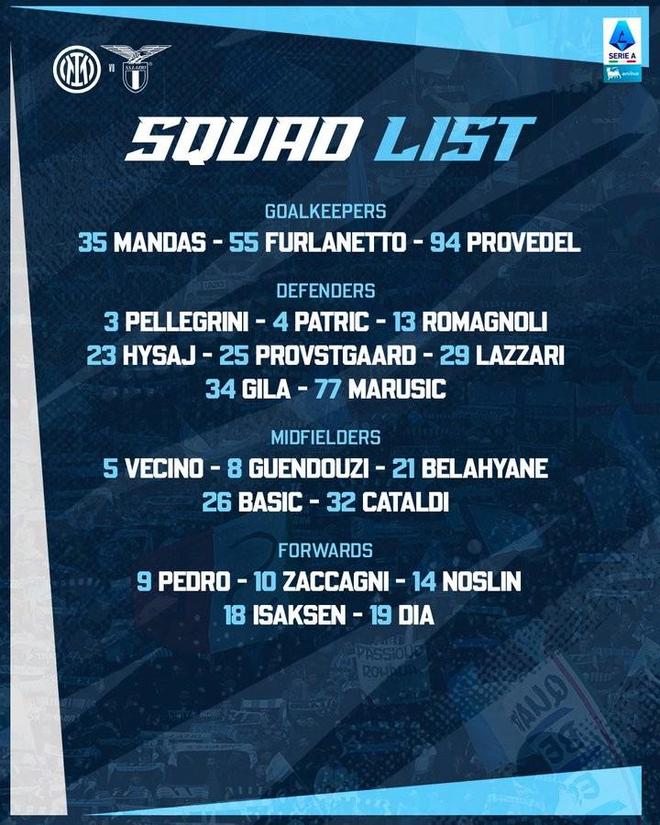拉齐奥公布战国米名单:扎卡尼、佩德罗在列,6名球员缺阵