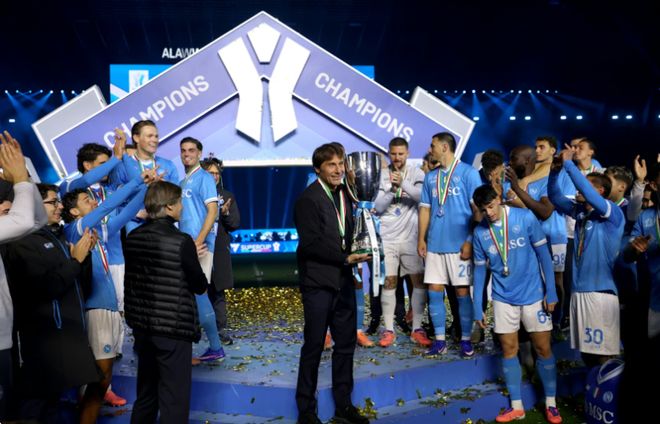今晨意大利超级杯决赛,那不勒斯凭借内雷斯的梅开二度,2比0击败博洛尼亚,夺得2025年在意甲冠军之后的第2座奖杯。然而,在夺冠的香槟与欢呼声中,主帅孔蒂却为全队注入了一剂强烈的