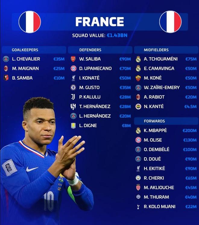 新一期法国队身价榜:姆巴佩、奥利塞前2,26人总身价14.3亿