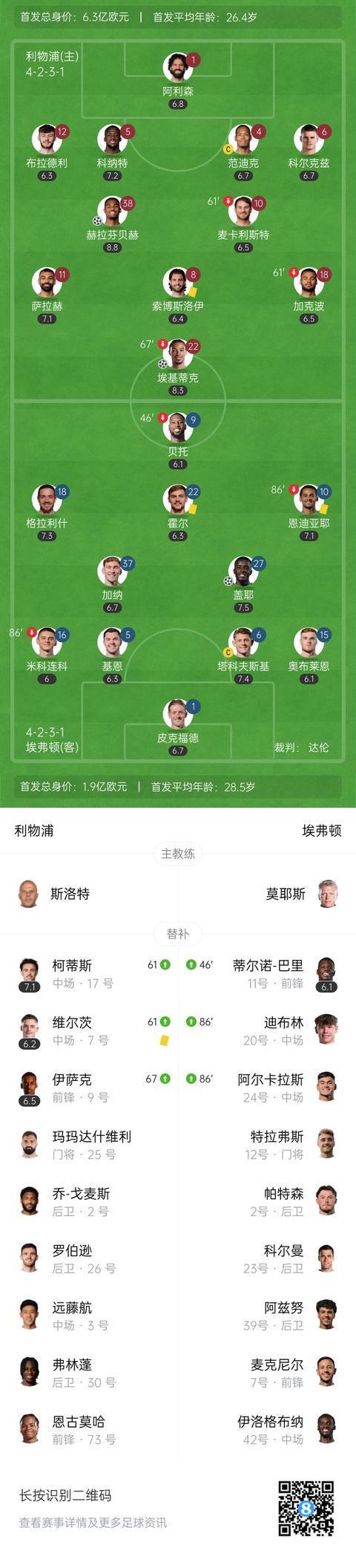 下半场伤停补时3分钟,全场比赛结束,最终利物浦2-1埃弗顿。