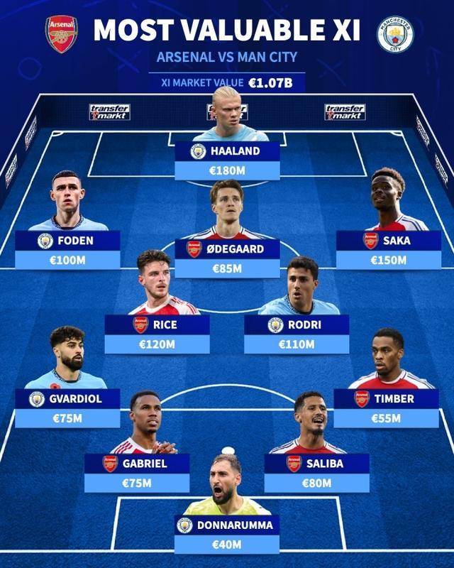 赛前,德转盘点了对阵双方的身价最贵11人阵容,这套阵容总身价达到了惊人的10.7亿欧,哈兰德凭借1.8亿欧的身价领衔,萨卡1.5亿欧元次之。