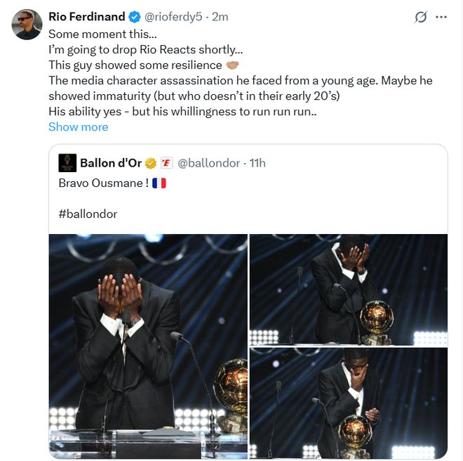 雷速体育9月23日宣 英超名宿费迪南德在社媒转发了金球奖官方发布的登贝莱获奖动态,并配文赞赏了今年的金球奖得主。