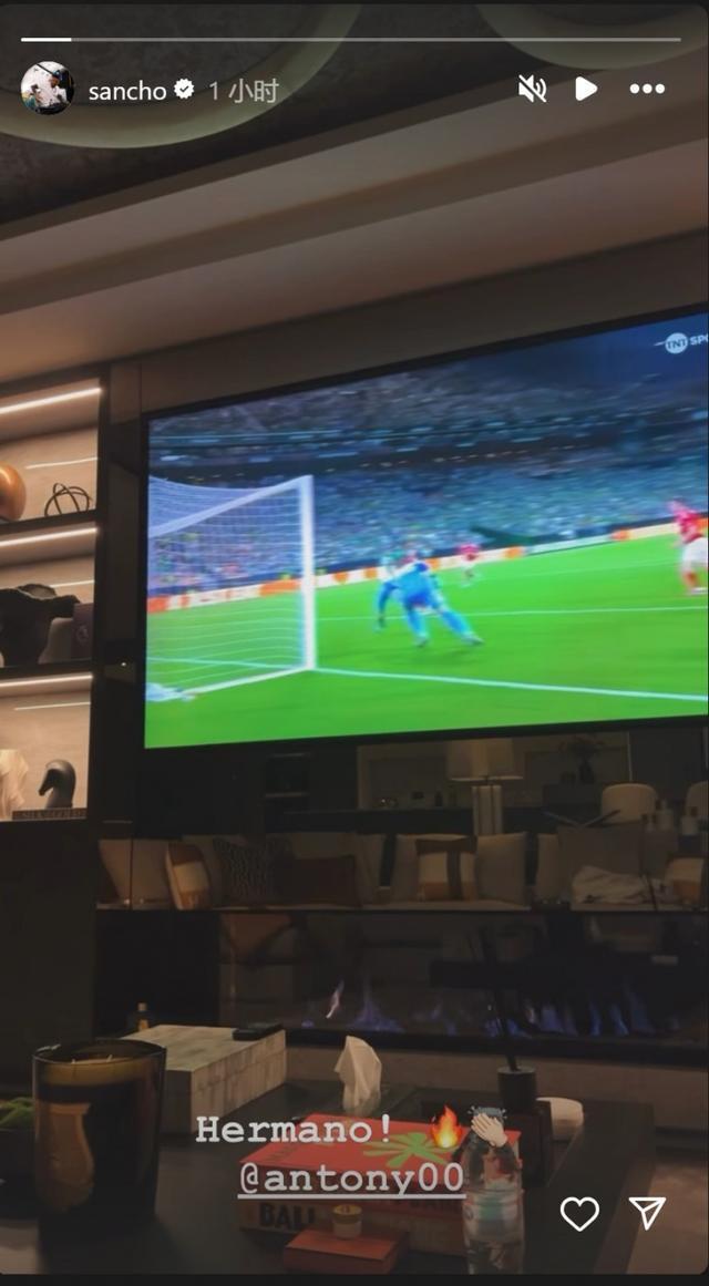 桑乔通过电视观看了这场比赛,他在社交媒体上晒出安东尼进球的视频,配文:“兄弟!”